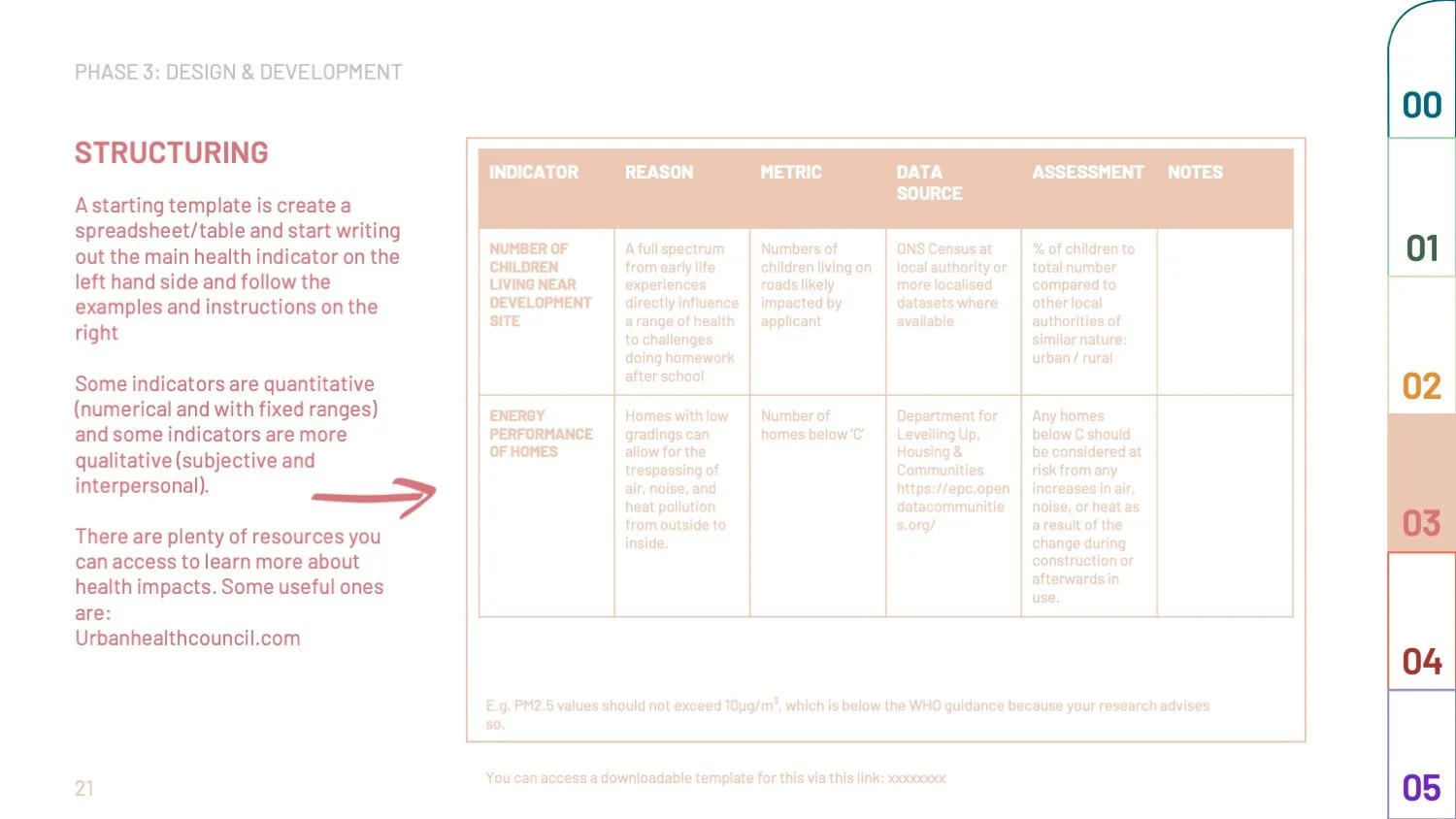 At the end of this exercise you are expected to have a spreadsheet style list of domains, topics, indicators, metrics and data sources that people can go to in order to do the assessment. We have provided an example of how this can work.